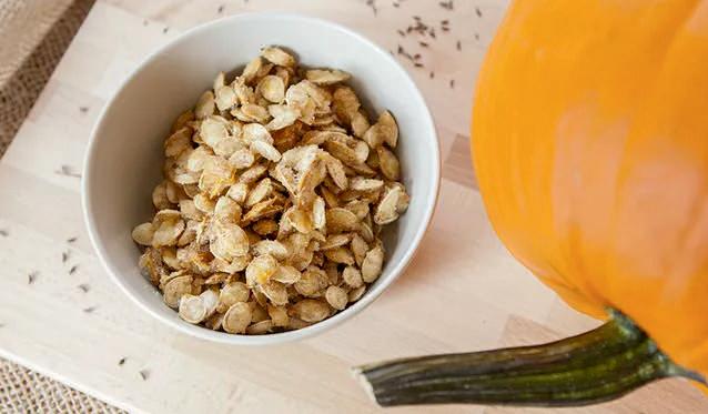 Step 4: Heat the oil in a large nonstick skillet over medium heat, and stir in the toasted pumpkin seeds along with 2 tablespoons of sugar. Cook and stir the seeds until the sugar forms a coating on the seeds, 2-3 minutes. Stir the caramelized seeds into the bowl of sugar-spice mixture, toss to coat, and let cool.