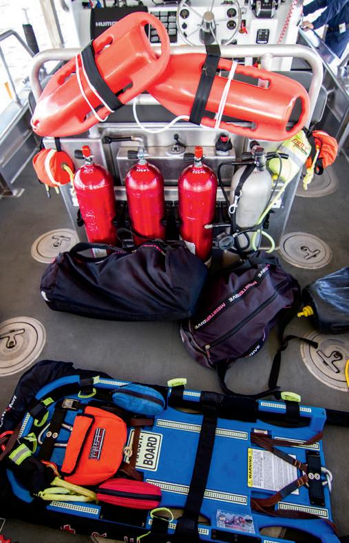 While fires on boats are rare, medical crises are not. Murphy estimates that 80 percent of Station 94’s calls are generated because of medical emergencies, whether on land or water. Every crew member assigned to Station 94 is dive qualified and trained to rescue people in up to 60 feet of water; however, crews are just as capable on land. Crew members are trained to fight fires and respond to medical emergencies, wherever they occur.