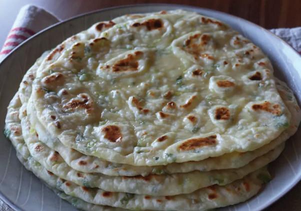 Step 6: Heat a cast iron skillet over medium-high heat until hot. Transfer dough circles into the hot dry skillet and cook until little bubbles form on the surface and the underside is lightly browned, about 1 minute. Flip naan over and cook for 1 more minute. Press down slightly with a spatula to increase the heat during cooking. Flip over twice more and cook for an additional 15 seconds per side, but make sure not to overcook to preserve the texture. Naan should still be flexible when you remove it from the skillet onto a plate.