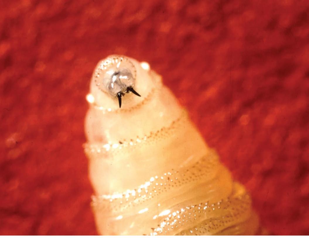 New World screwworm larva, like the one pictured, will hatch and feed on the flesh of the living animals, typically cattle. Cases in humans are rare but can be fatal.