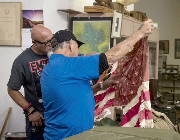 A museum guide describes a flag to a patron during a Veterans Day opening at the Blackland Museum in 2018. Staff file photo