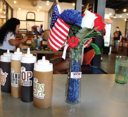 On November 18, 2023, Spring Branch’s own VFW Post 8790 hosted a Red, White & Blue Veterans Appreciation BBQ at Feges BBQ on Long Point Road. Patrick Feges, owner of the popular barbecue establishment and veteran himself, offered to cook the provided food with his staff while the meat for the feast was provided by Tim Smith, an auxiliary VFW member and longtime Houston Livestock Show & Rodeo Steer Auction Committee chair. The delicious fare included steak fajitas, Salisbury steak, meatballs, baked beans, green beans, and dirty rice and brought 250 veterans and guests to the event. Centerpieces to decorate the tables were put together by auxiliary members before the event, balloon displays graced the post, and goodie bags were generously donated by H-E-B. Post 8790 members assisted by manning the greeting table and serving food, and their collective efforts brought in ten new members to the post, including Patrick Feges himself.