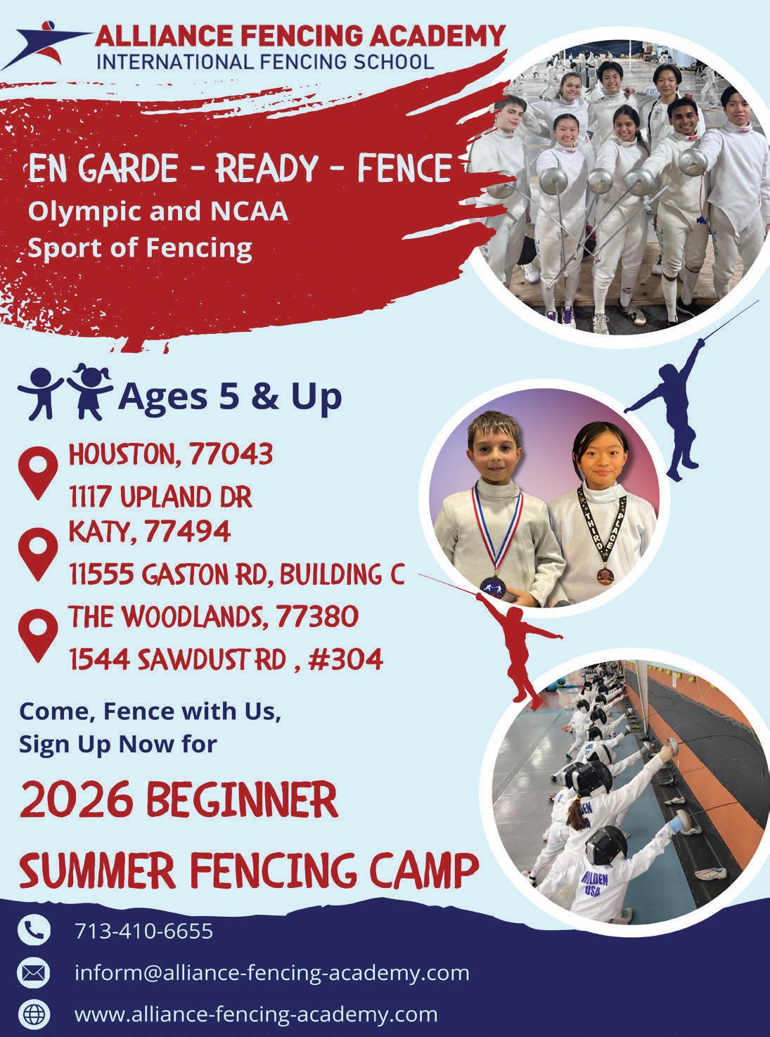 Introductory Experience for New Fencers ( Ages 5 –14): Houston: June 1–5, June 22–26, July 27–31, August 3–7, 9 am–3pm Katy: June 22-26, July27–31, August 3–7, 9 am–3 pm, The Woodlands: June 22–26,July 27–31, August 3–7, 9 am–3 pm, Alliance Mega Epee Camp to Prepare for Summer National Championships (All Ages): June 8–12,Y12–Senior, June 15–19,Y8–Senior, June 22–26,Y8–10, Information at 713.410.6655 or scan QR code.