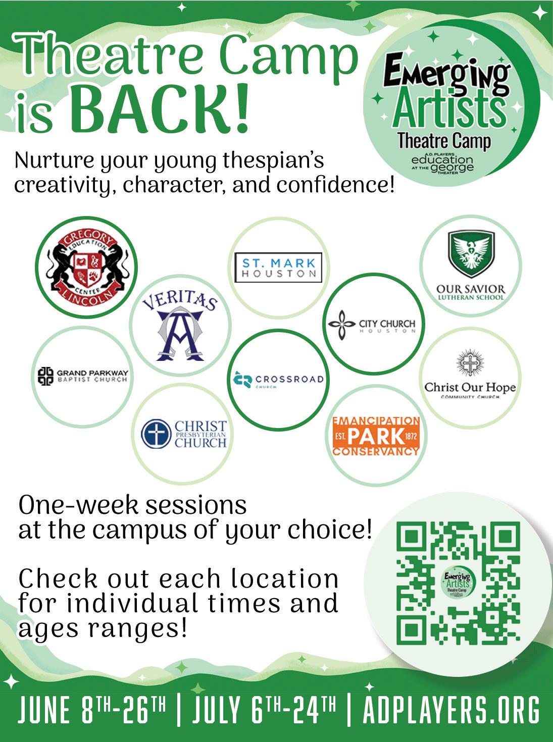 June 8–26, July 5–24, Nurture your young thespian’s creativity, character, and confidence. One week sessions at your choice of 10 campuses. Sponsored by A.D. players Education at The George Theater. Information at adplayers.org