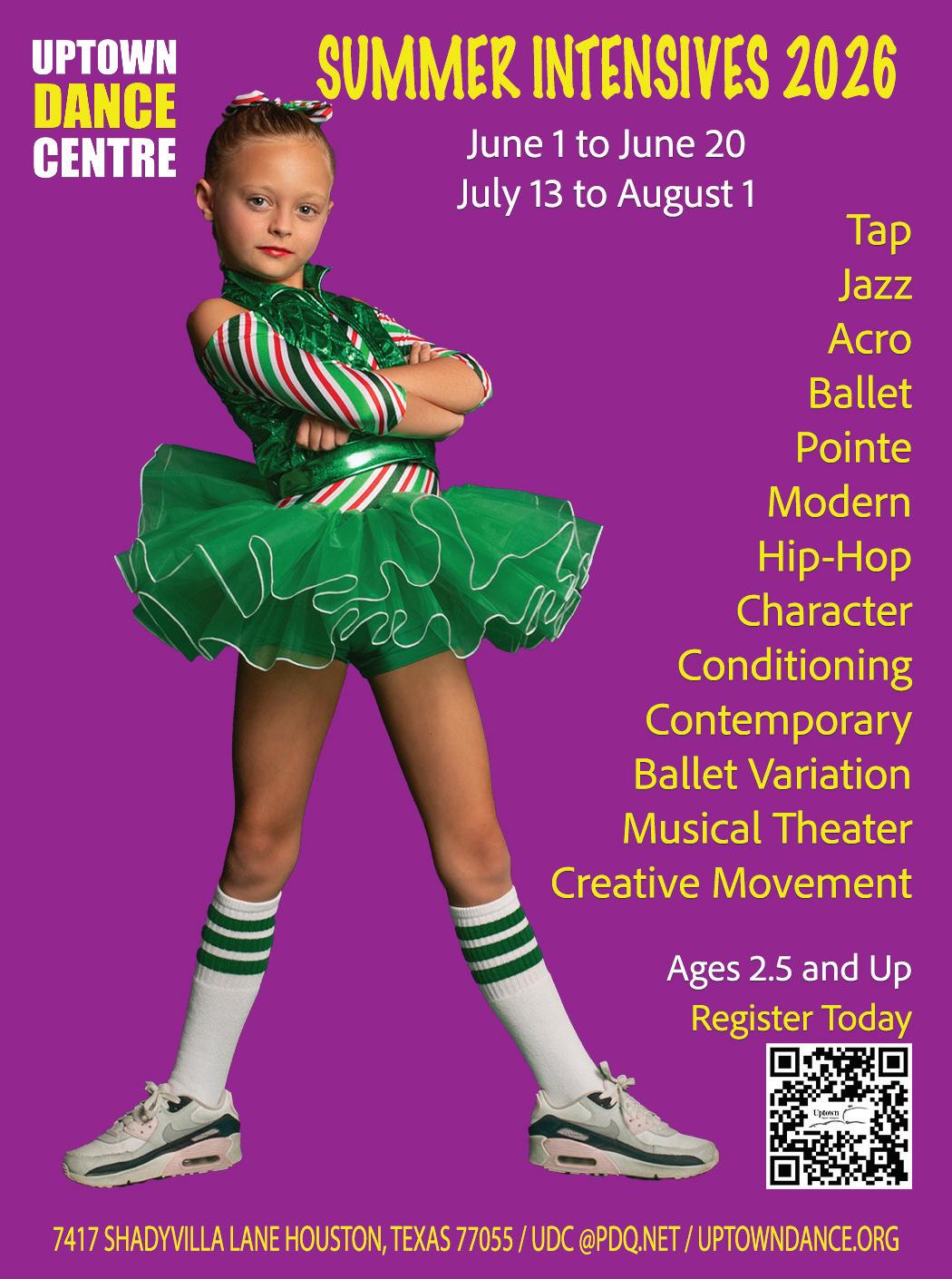 Ages 2.5 and up, Tap, Jazz, Acro, Ballet, Pointe, Modern, Hip-Hop, Character, Conditioning, Contemporary, Ballet Variation, Musical Theater, Creative Movement, June1–June 20, July 13–Aug. 1, scan QR for more information.