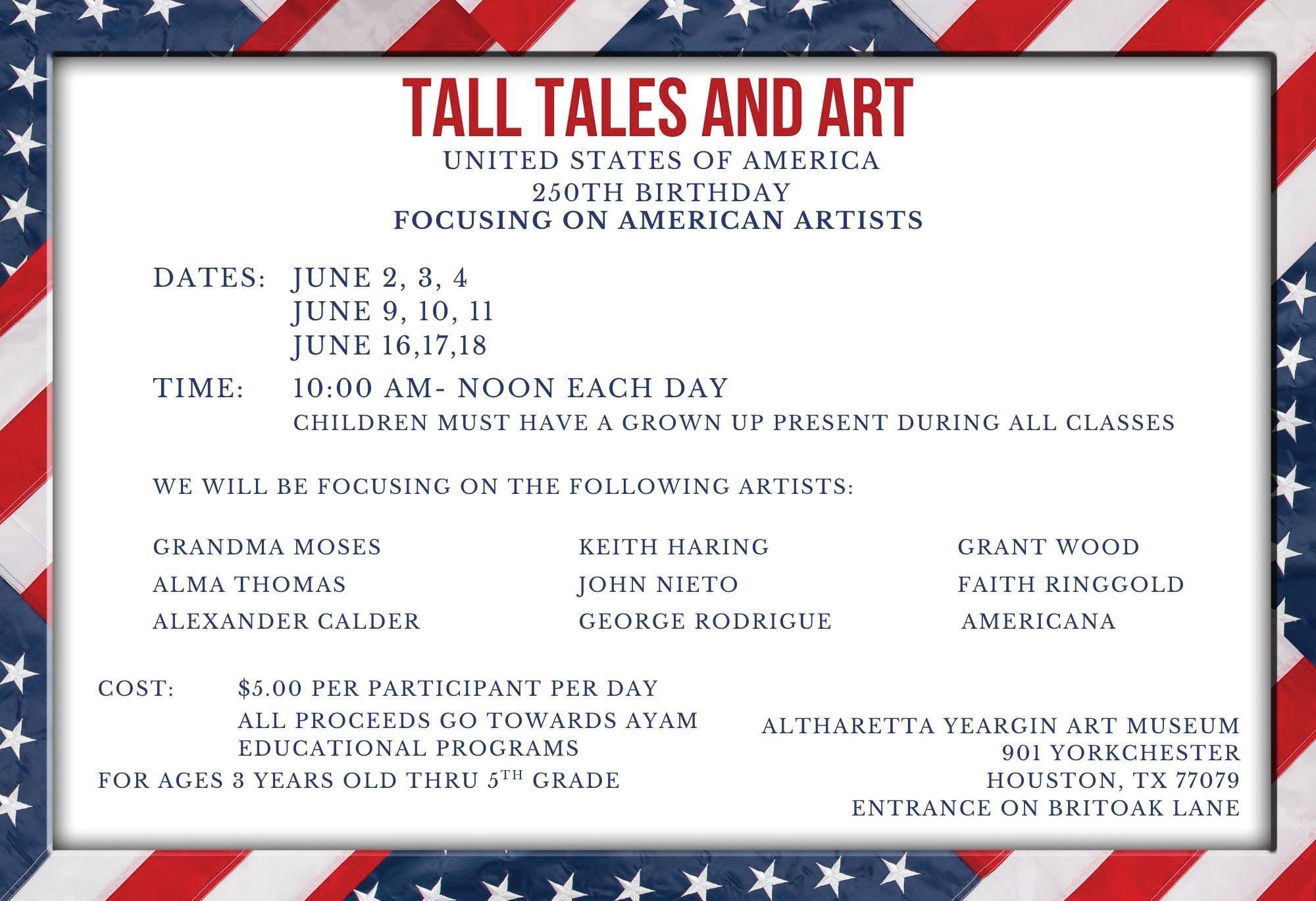June 2, 3, 4, 9, 10, 11, 16, 17, 18 Tall Tales Art- 10AM-12PM, Ages 8-5th grade, $5/person, Altharetta Yeargin Art Museum