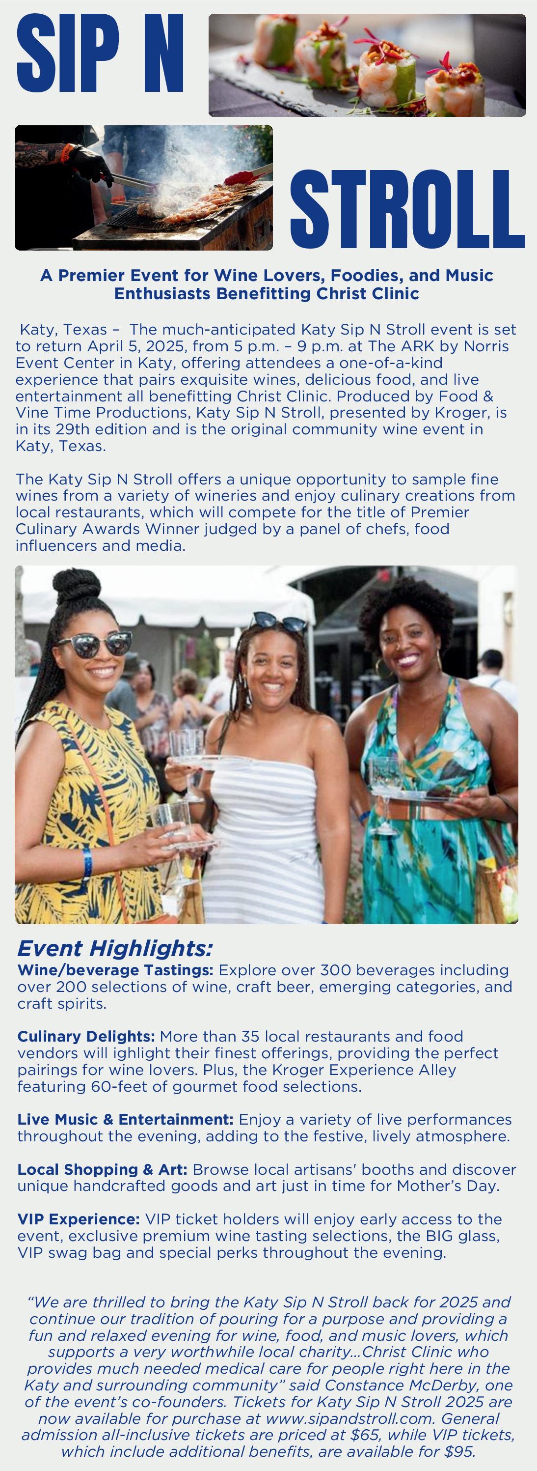 April 5 Sip and Stroll benefitting Christ Clinic, 6 -10 pm, The ARK by Norris Event Center,