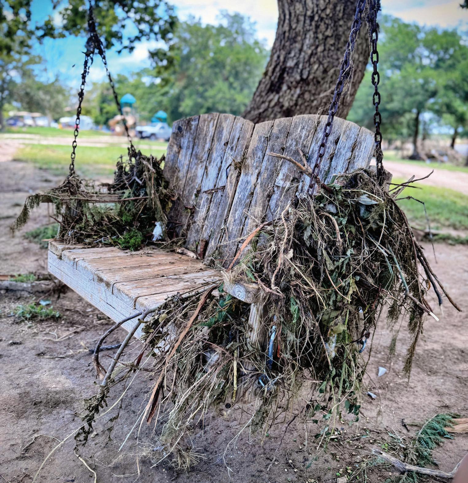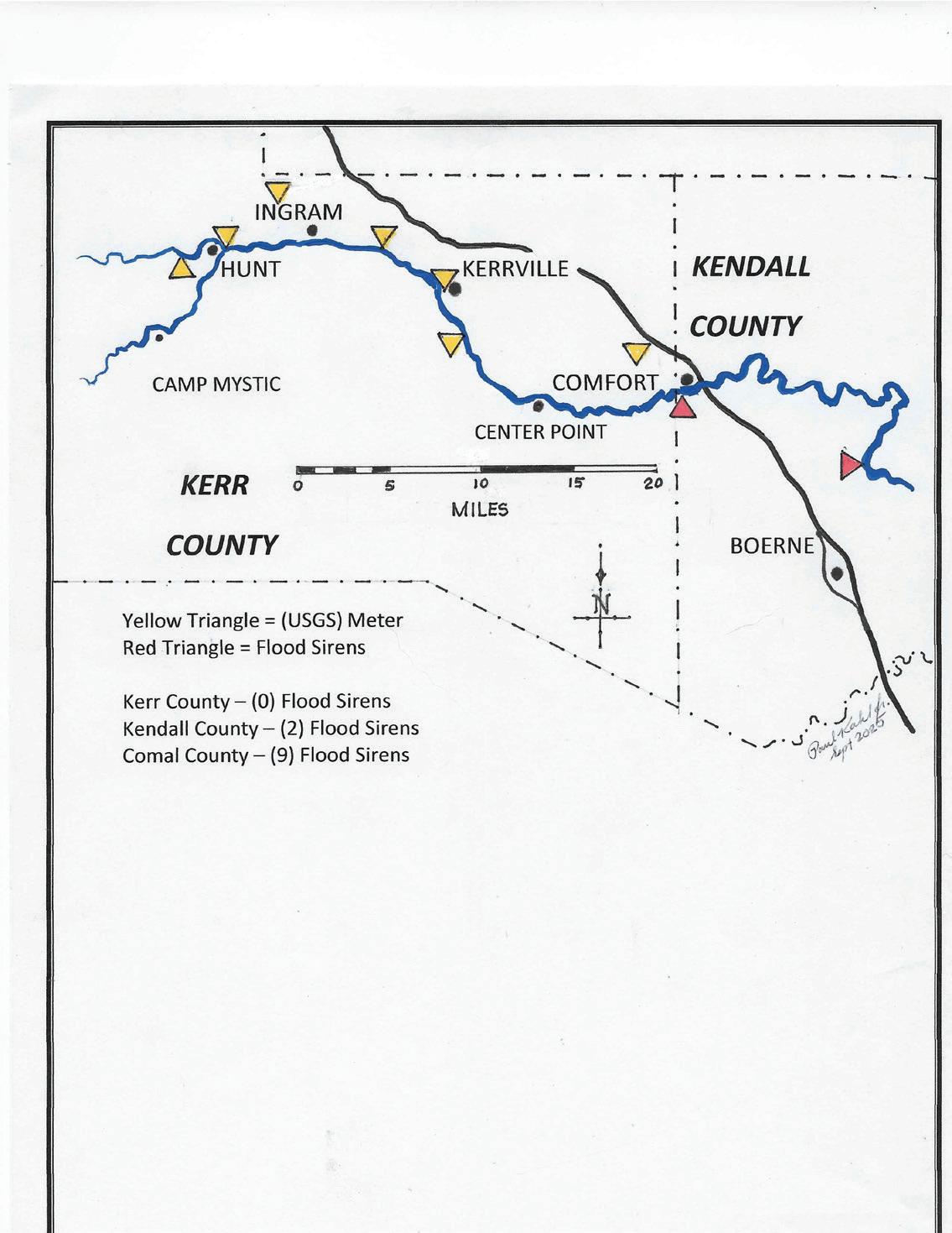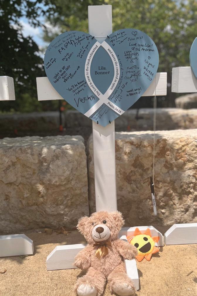 High waters and a memorial laden with beautiful flowers commemorates the tragic events of the Camp Mystic flood on July 4. An early warning siren in the foreground highlights the confounding fact that in a location known as "Flash Flood Alley," there were zero sirens in place at the time of the flooding.