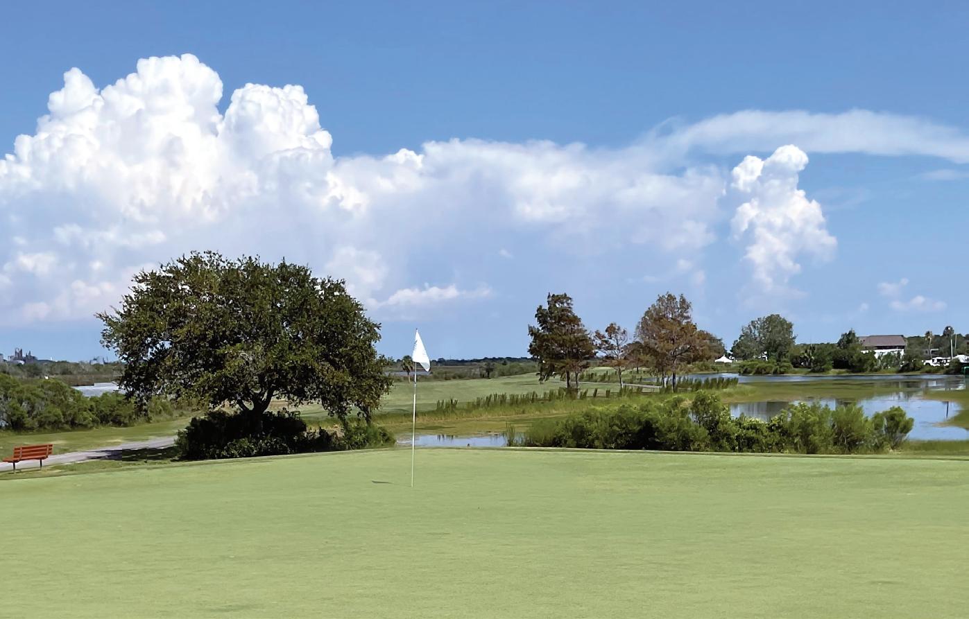the approach and trees on the right near the preferred landing area. More water awaits behind the smallish and undulating putting surface at the back left. It’s one of the toughest pars on the Gulf Coast.