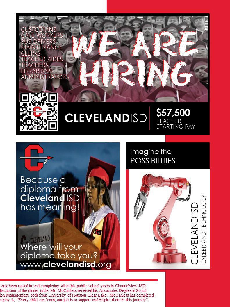 Cleveland ISD is led by Superintendent Stephen W. McCanless. Mr. McCanless is a Native Texan, havingbeenraisedinandcompletingallofhispublicschoolyearsinChannelviewISD. Being from a family of 4 brothers and 5 sisters, McCanless says that education was always a topic of discussionatthedinnertable.Mr. Science from San Jacinto College, his Bachelor’s Degree in Literature and Master’s Degree in EducationManagement,bothfrom all course work for his Ed.Din Educational Supervision at Lamar University.. Mr. McCanless’s philosophyis,“Everychildcanlearn;ourjobistosupportandinspiretheminthisjourney”.