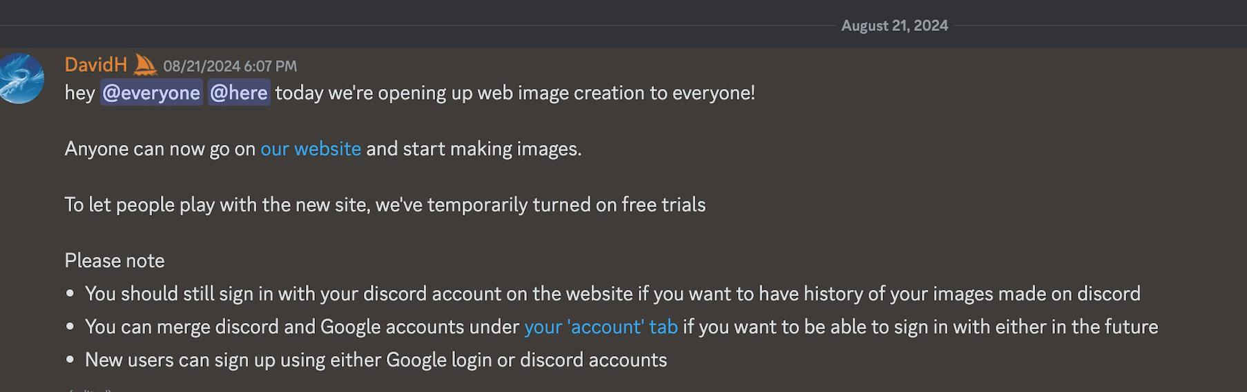 Message from David Holz , Midjourney founder, announcing the website launch on Discord
