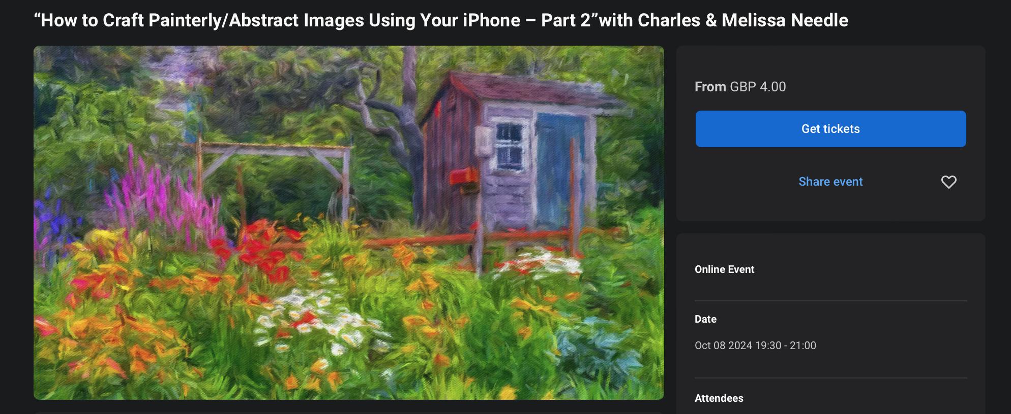 We will still be using Billetto in the immeadiate future, as we wait for the RPS CRM to be completely stable and user friendly, before returning, but will continue to keep you all updated on that situation. So at present all upcoming workshops are listed here. Just add a name to the search bar if you are looking for a particular presenter. But this link takes you directly to the DI Page on Billetto.