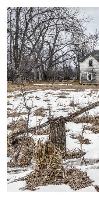Target Practice (this page) was in my first submission but would not have fitted in with my second which has a more wintery feel and more earthy tones. I like the image because it is simple with three subjects: half a car, a cottonwood tree and a building that has completely fallen down and succumbed to the vegetation around it. It tells a story; of people using what's left of the old car as target practice and the loss and demise of another home whilst the cottonwood stands tall and observant.