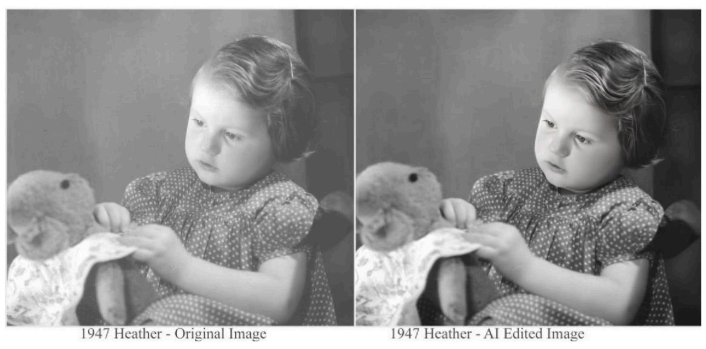I always work on a duplicate layer, to be able to adjust the filter. The last image I did was rather too aggressive, so I lowered the opacity of that layer whilst in Photoshop made it a bit less AI. In one case, it removed part of my mum’s necklace, so with the original layer and a layer mask on the edited layer could bring it back again. The two layers can now be flattened and duplicated for any further editing required in Photoshop.