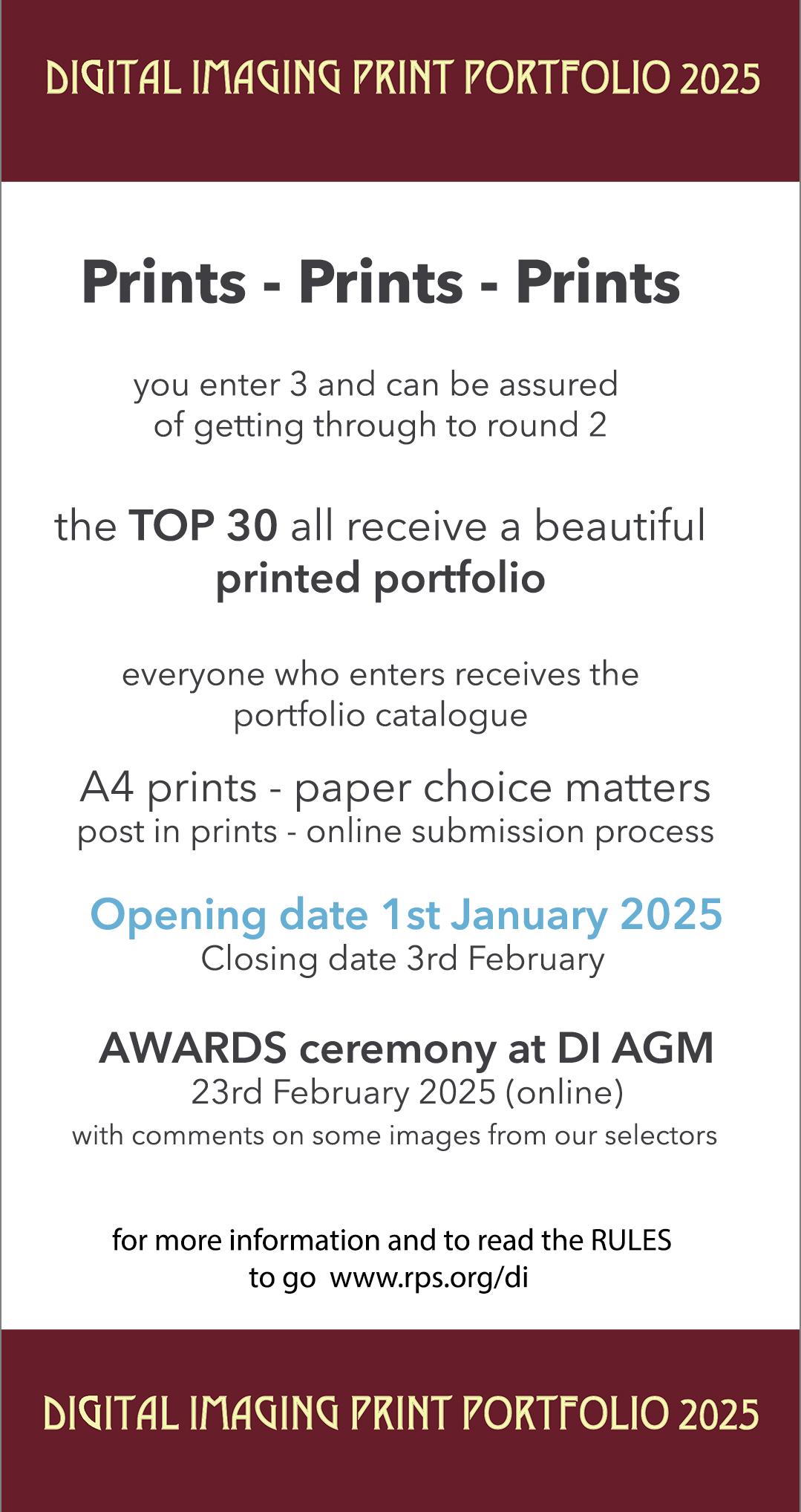 The Print Portfolio, Page 6, has already been announced so we hope you are all giving some thought to your 3 images you will submit. Being amongst the top 30 means you get a super quality Print Portfolio 2025 - this represents the best of DI members’ work and is our ‘exhibition’.