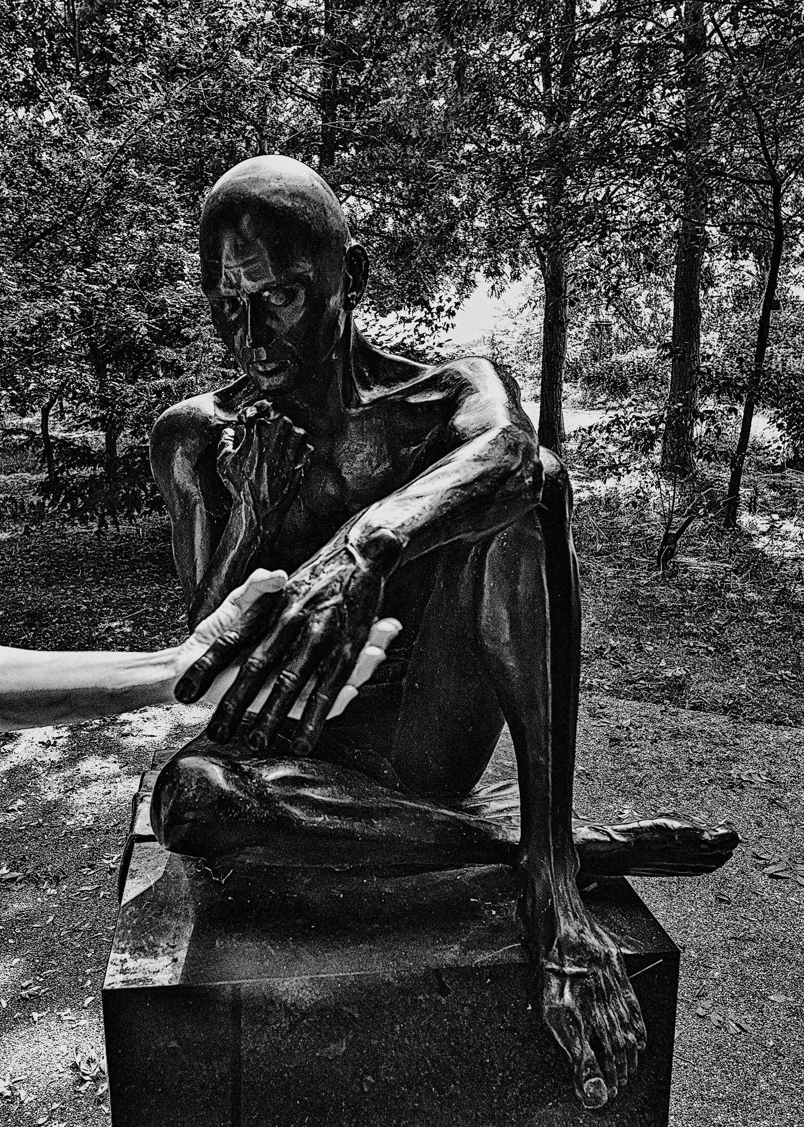 The statue’s outstretched hand is being held by my wife as a sign of empathy.