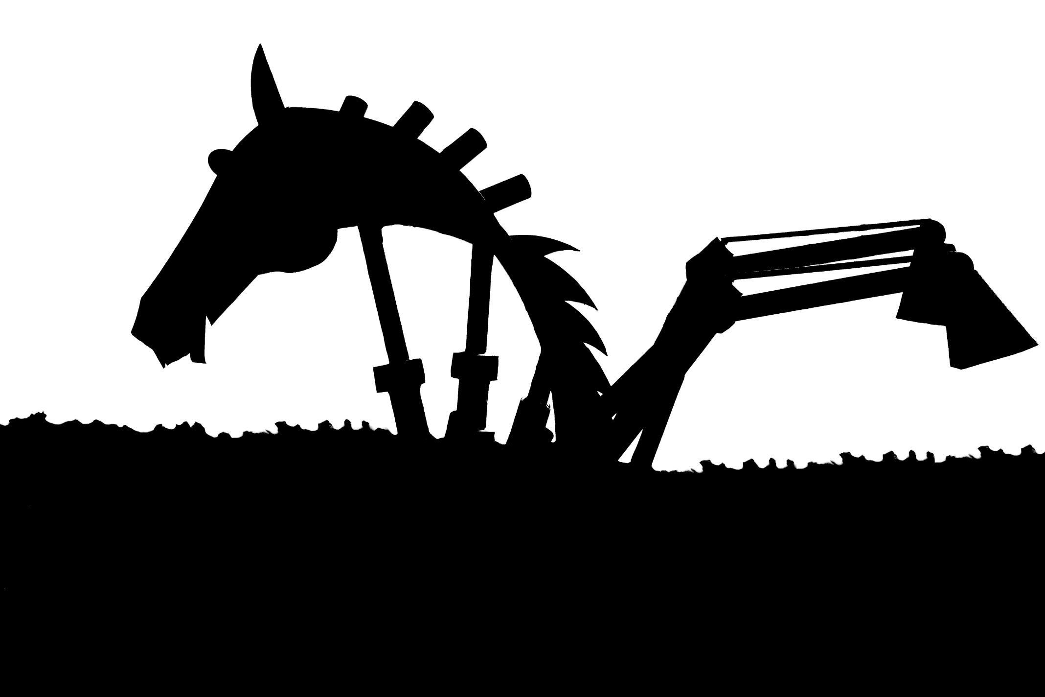 This image is a silhouette of a horse, made of pieces of metalwork, apparently jumping a hedge in its efforts to be free.
