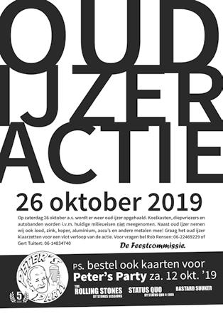 Op zaterdag 26 oktober a.s. is het weer tijd voor onze jaarlijkse oud ijzer actie. Naast oud ijzer nemen we ook lood, zink, koper, aluminium en andere metalen mee. Helaas mogen we i.v.m. de huidige milieueisen geen koelkasten, diepvriezers en autobanden meenemen. Het zou fijn zijn als u het oud ijzer op de genoemde data alvast klaar zet, zodat onze actie vlot verloopt. We hopen op een goede opbrengst.