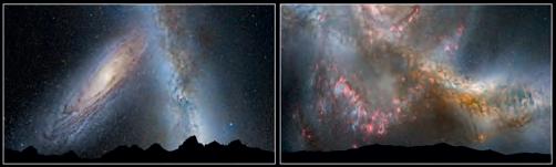 Ons zonnestelsel draait, samen met andere sterren, in de rand van de Melkweg rond het centrum. Op de onderstaande foto kijken we naar het centrum.