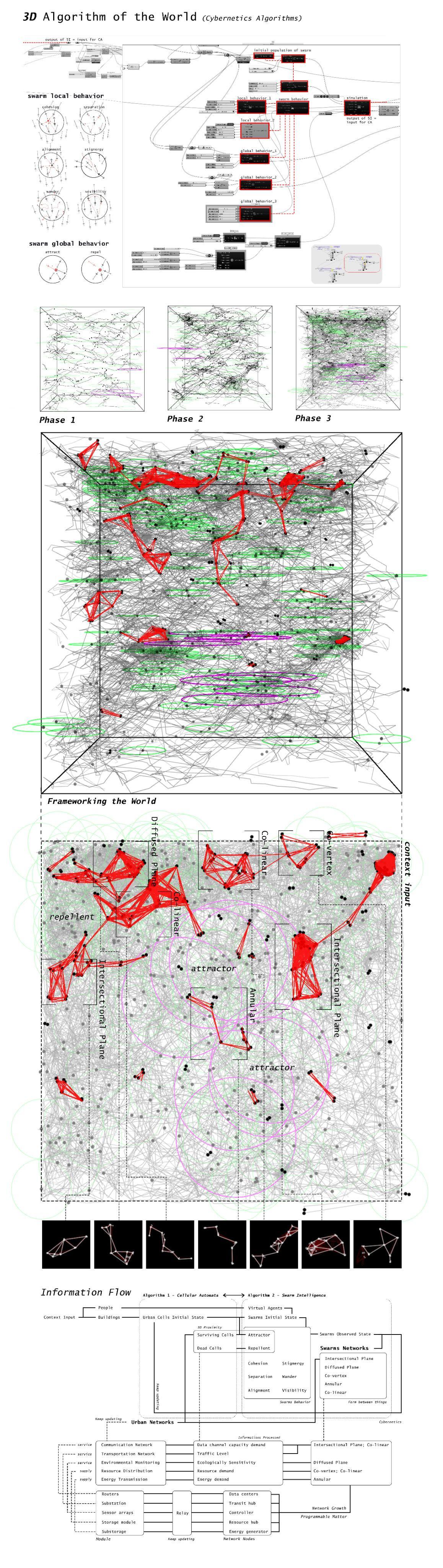ergo cogito—In response, InfoMorph processes these doubts by adopting computational and algorithmic methodologies inspired by ecological systems Through Cellular Automata and Swarm Intelligence, I developed simulations that model collective behaviors, enabling urban environments to reorganize themselves dynamically. These algorithms guide resource flows spatial configurations, and architectural forms creating adaptive frameworks capable of evolving in real time This process leverages information as the driving force for creating metabolistic urban networks—systems that continuously self-regulate and respond to changing environmental and social conditions.