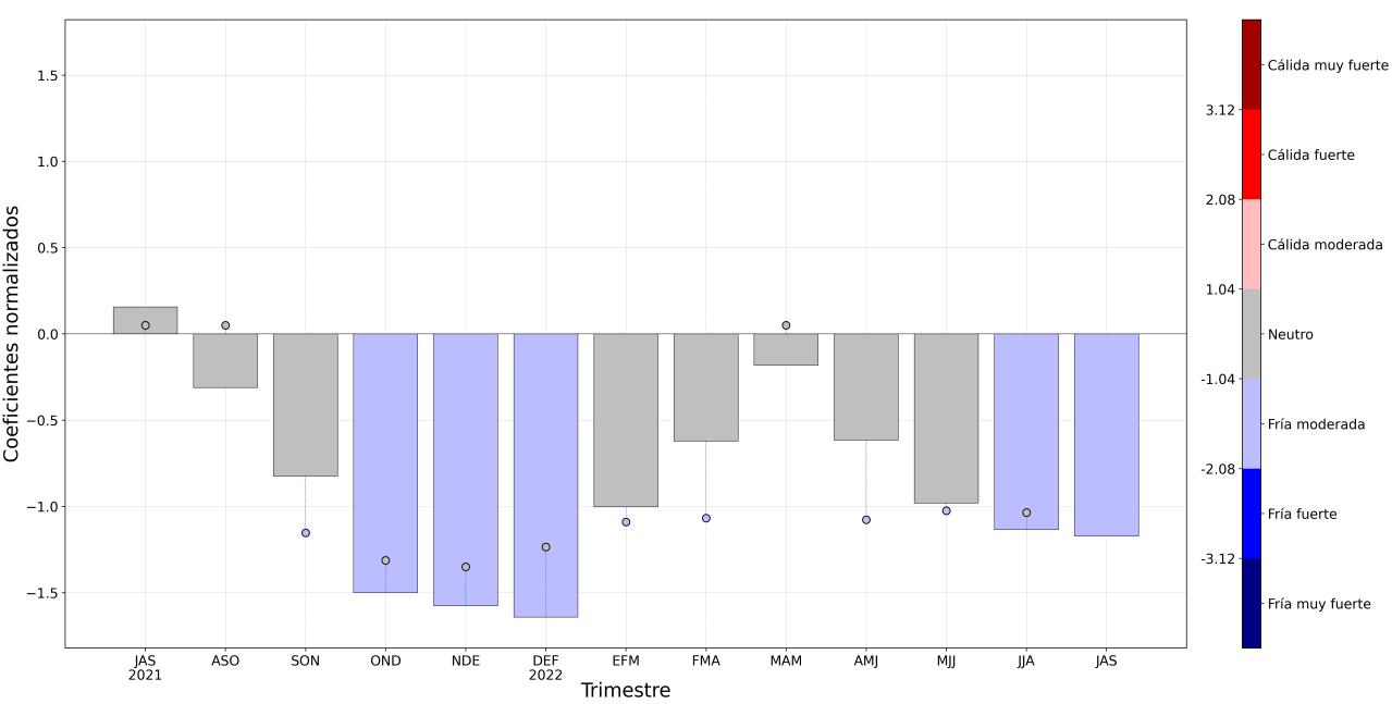 Para este periodo, cada una de las regiones El Niño declaradas por la Oficina Nacional de Administración Oceánica y Atmosférica (NOAA, por sus siglas en inglés) manifestó condiciones frías para el OPT correspondientes a un escenario La Niña, diagnóstico que también fue evidenciado a partir del Índice Niño Oceánico (ONI), Índice Multivariado ENOS (MEI) e Índice oscilación Sur (SOI), los cuales muestran condiciones coherentes con la presencia de una fase fría de ENOS (Figura 3). Comparando con el mes anterior (agosto 2022), el oriente del Pacífico ecuatorial muestra una tendencia al fortalecimiento de las condiciones frías, evidenciándose una disminución en la magnitud de las anomalías de la TSM en la Región Niño 1+2 de aproximadamente 0.44 °C.