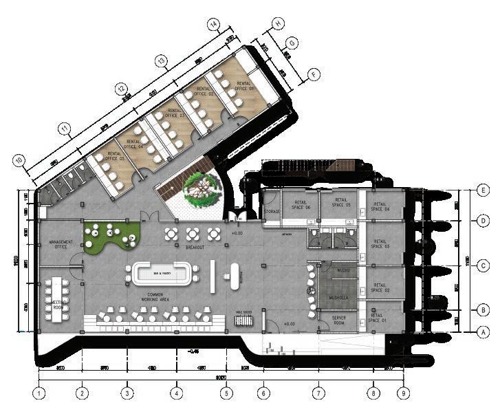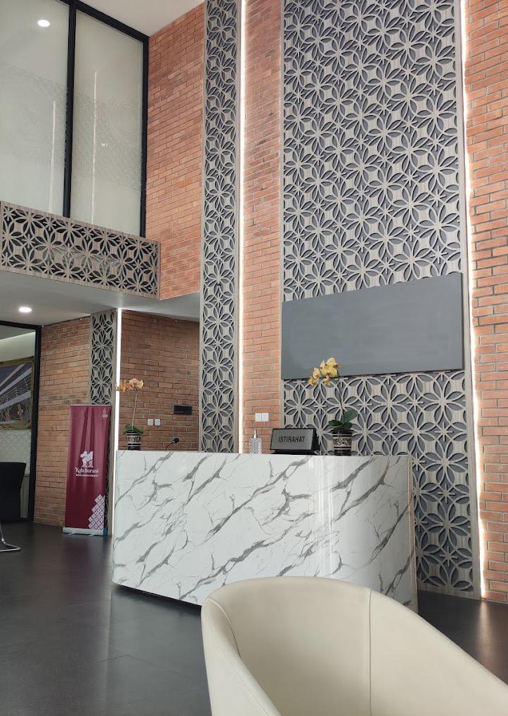 From the existing building that was previously used as a car showroom, the main hall was proposed to be split into 2 level to cater the office room necessity leaving some part of the double height ceiling area to be used as the main lobby of the office. The car workshop area on the back part of the site was proposed to be used as a multifunctional hall and also parking area for the office.