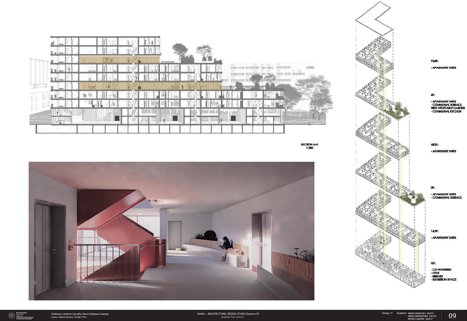 As architecture can have a major impact upon the quality of life for the citizens in urban context, this studio challenged on how to design an innovative sustainable environments that offer well-being to Milano citizens which include housing, urban spaces, and landscape. Furthermore, it focused on how we can create the inclusive housing that will cater the needs in all ages, different social strata, cultures, within intergenerational and multicultural community logic that avoids to build a segregation in between the residents and promote a more diverse housing environment.