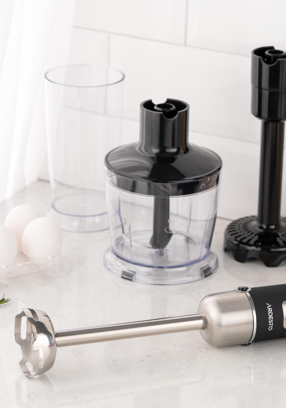 Measuring cup 600 ml, chopper 500 ml, whisk attachment