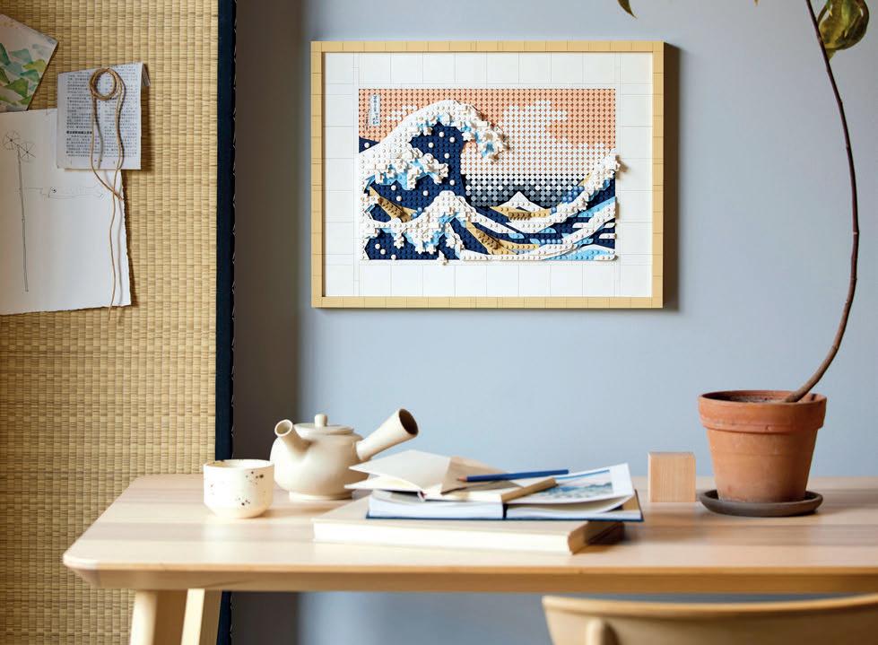 Розмір моделі наближено до оригіналу, а золота рама та білий паспарту додають роботі завершеності. У центрі – головна хвиля, яка накриває рибальські човни, а на горизонті проглядається спокійна гора Фудзі. Як і інші набори серії LEGO ART, ця модель