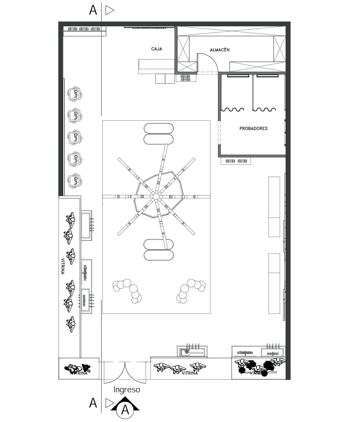 CURSO EST RAT EGIAS DE ILUMINACIÓN COMERCIAL DOCEN T E ARQ. CLAUDIA MARIA DELGADO ESCALA 1:100 FECHA 11/ 10/22 PROYECTO DISEÑO DE ILUMINACIÓN T IENDA RE TAIL DESIGUAL LAMINA A02 ALUMNA DINA SAMAN T HA DE LA CRUZ CAMAC