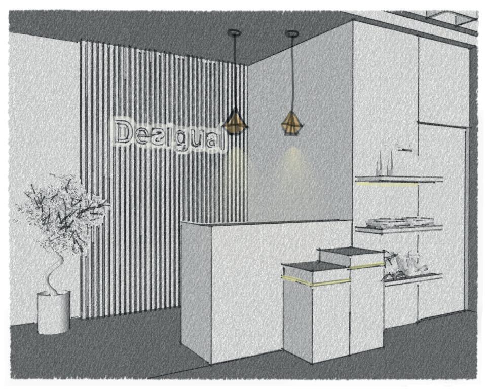 CURSO EST RAT EGIAS DE ILUMINACIÓN COMERCIAL DOCEN T E ARQ. CLAUDIA MARIA DELGADO ESCALA 1:100 FECHA 11/ 10/22 PROYECTO LAMINA A16 ALUMNA DINA SAMAN T HA DE LA CRUZ CAMAC DISEÑO DE ILUMINACIÓN T IENDA RE TAIL DESIGUAL 16 ESCAPARATE - VISTA 3D T iend a De s ig u a l ®