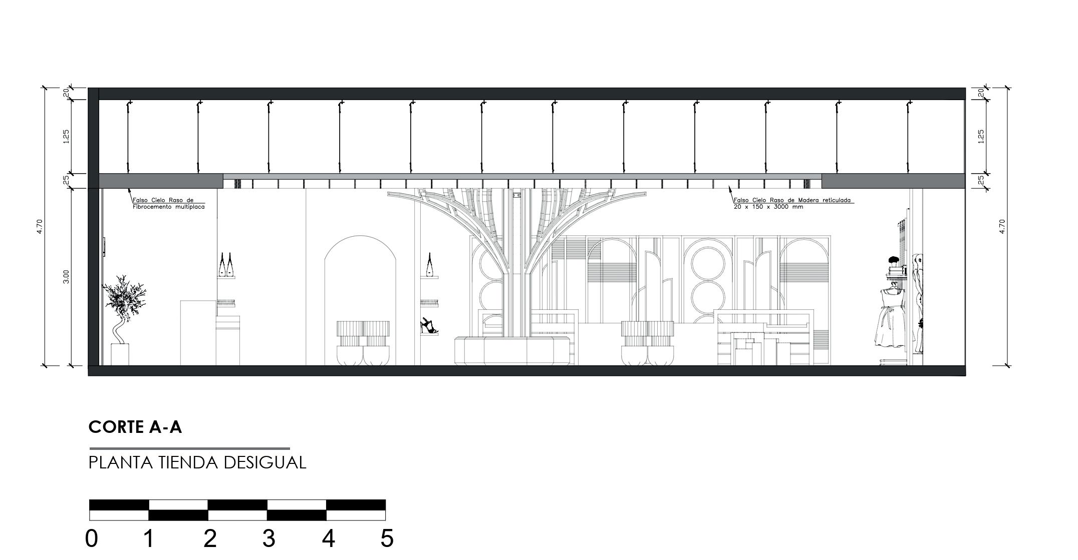 CURSO EST RAT EGIAS DE ILUMINACIÓN COMERCIAL DOCEN T E ARQ. CLAUDIA MARIA DELGADO ESCALA 1:100 FECHA 11/ 10/22 PROYECTO LAMINA A05 ALUMNA DINA SAMAN T HA DE LA CRUZ CAMAC 5 CORTE LONGITUDINAL T iend a De s ig u a l ® DISEÑO DE ILUMINACIÓN T IENDA RE TAIL DESIGUAL