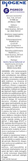 Enti, Proloco e Associazioni culturali e sportive possono comunicarci un evento via email all'indirizzo redazione@ diogeneannunci.it. Gli annunci verranno pubblicati sul giornale online e nella rubrica Diogene News del giornale cartaceo. In alternativa è possibile inviare i contenuti redazionali e gli annunci via posta tradizionale a DIOGENEV.le Gramsci, 34 - 47122 Forlì (FC) oppure consegnarli a mano allo stesso indirizzo. La redazione deciderà di volta in volta se pubblicare o meno le informazioni ricevute a suo insindacabile giudizio. Nell'impossibilità di verificare tutto il materiale ricevuto, si fa presente sin da ora che la responsabilità dei diritti iconografici e di altri diritti esclusivi di terzi è di chi ci fornisce le informazioni.