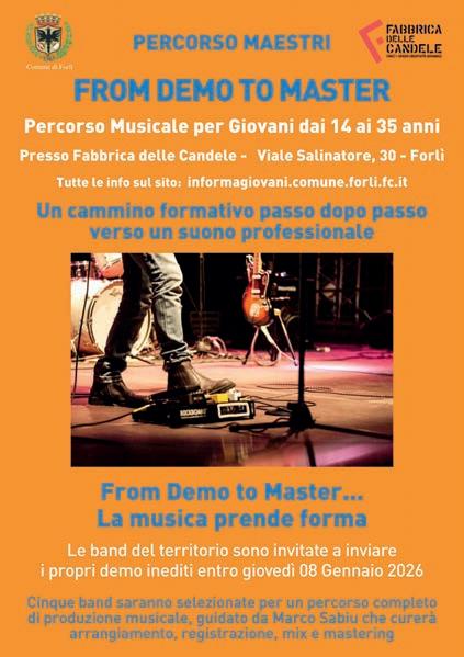 Palazzo Sangiorgi, corso Garibaldi 98 Omaggio ad Angelo Masini Concerto diretto e preparato da Angelo Gabrielli, con i tenori Ra aele Abete, Giacomo Leone e Matteo Macchioni, e al pianoforte Mirca Rosciani, su musiche di Rossini, Bellini, Donizetti, Verdi e Wagner. L’iniziativa crea un ponte ideale tra la grande tradizione del tenore forlivese e l’eredità di Pavarotti, valorizzando il lascito di Masini che volle fondare proprio a Forlì un Istituto musicale dedicato ai giovani musicisti e in particolare ai cantanti. L’omaggio al grande tenore è un’ideale anticipazione delle manifestazioni che avranno luogo nel 2026 per celebrarne il centenario dalla morte. Ingresso libero.