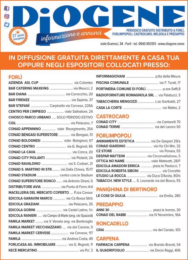 Enti, Proloco e Associazioni culturali e sportive possono comunicarci un evento via email all'indirizzo redazione@ diogeneannunci.it. Gli annunci verranno pubblicati sul giornale online e nella rubrica Diogene News del giornale cartaceo. In alternativa è possibile inviare i contenuti redazionali e gli annunci via posta tradizionale a DIOGENEV.le Gramsci, 34 - 47122 Forlì (FC) oppure consegnarli a mano allo stesso indirizzo. La redazione deciderà di volta in volta se pubblicare o meno le informazioni ricevute a suo insindacabile giudizio. Nell'impossibilità di verificare tutto il materiale ricevuto, si fa presente sin da ora che la responsabilità dei diritti iconografici e di altri diritti esclusivi di terzi è di chi ci fornisce le informazioni.