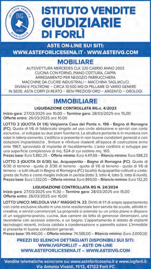 Concorso Auser “Dare vita agli anni” Sono aperte fino al 10 marzo le iscrizioni alla 34esima edizione del Premio letterario “Dare vita agli anni”, dedicato alla memoria di Viola Talentoni. Il premio è articolato in due sezioni, racconto a tema libero e poesia a tema libero, ed è aperto a tutti; la partecipazione è gratuita. Le composizioni dovranno essere in lingua italiana, non superare le cinque cartelle dattiloscritte per i racconti e le trenta righe per le poesie. Ogni concorrente può partecipare ad una sola sezione con un solo elaborato, mai stato premiato in altri concorsi. La premiazione si terrà nel mese di maggio. Info: https://www. auserforli.it/wp-content/uploads/2024/12/ Bando-2025.pdf.