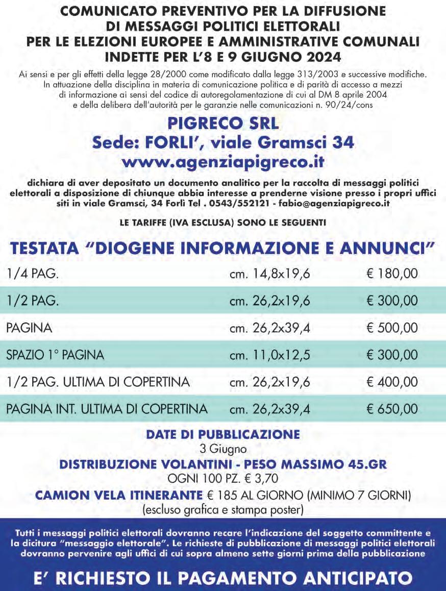 viale Gramsci, 34 - Forlì - tel. 0543.553131 - www.diogene.news 36 anni insieme Lunedì 20 Maggio 2024 N° 1220