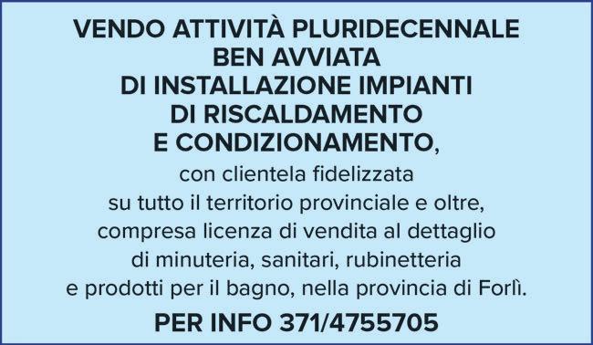 VENDO ATTIVITA’ PLURIDECENNALE ben avviata di installazione impianti di riscaldamento e condizionamento, con clientela fidelizzata su tutto il territorio provinciale e oltre, compresa licenza di vendita al dettaglio di minuteria, sanitari, rubinetteria e prodotti per il bagno, nella provincia di Forlì. Per info