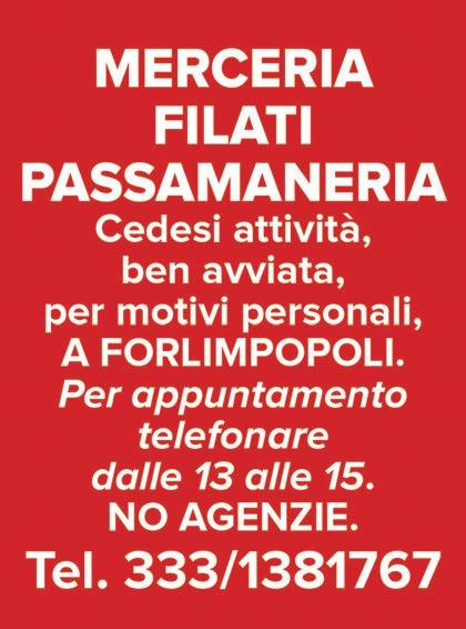 tel. 0543.85233 - www.fratellibandini.it NUOVA SEDE IN VIA VENTURINI 64-66 FORLÌ AMPIO PARCHEGGIO TUTTI I TIPI DI VERNICI E ACCESSORI PER L’EDILIZIA ACQUISTIAMO AUTO ALLUVIONATE SUPERVALUTIAMO IL TUO VEICOLO AUTO BIDENTE Tel. 335 6596432 - 339.5941188 VIA SOMALIA, 3 (zona Taverna Verde) - Tel. 0543 814152 - due.zeroca e@gmail.com due.zeroca e Lun.-Ven. 8:30-12:30 / 15:00-19:00 CAFFE’ IN GRANI, CIALDE, CAPSULE, MACCHINE DA CAFFE‘, ACCESSORI, ASSISTENZA SUL VENDUTO TE’, LIQUORI, DOLCIARIA. SELEZIONE DI SUCCHI DI FRUTTA 100% NATURALI, SENZA ZUCCHERI AGGIUNTI SCONTO 10% Via Gandhi, 16 (Zona art.) S. MARTINO IN STRADA (Forlì) - Tel. (0543) 86524 SOLUZIONI PER TUTTI I GUSTI TRASCORRI LA BELLA STAGIONE ALL’OMBRA DELLA TUA NUOVA COPERTURA www. .it 1200 N. MELDOLA (FC) Tel.0543/493570 www.fambatterie.it CONTINUA A P. 5