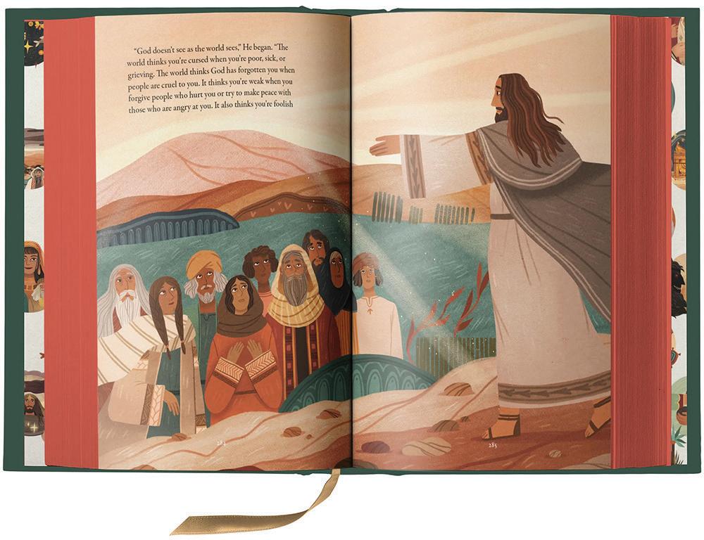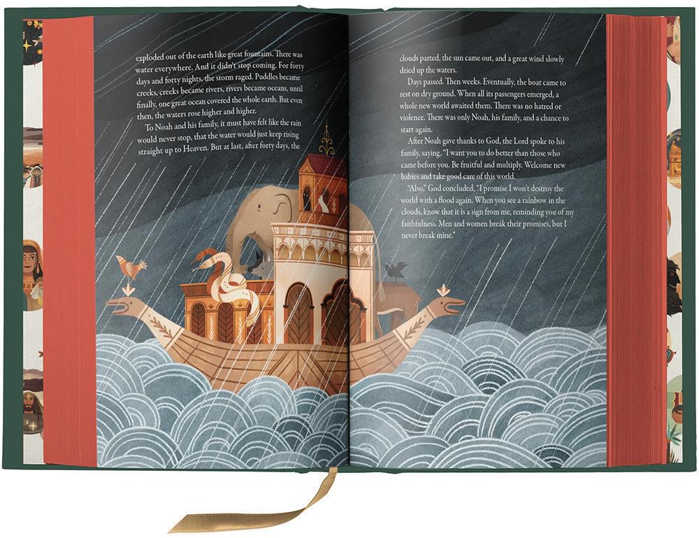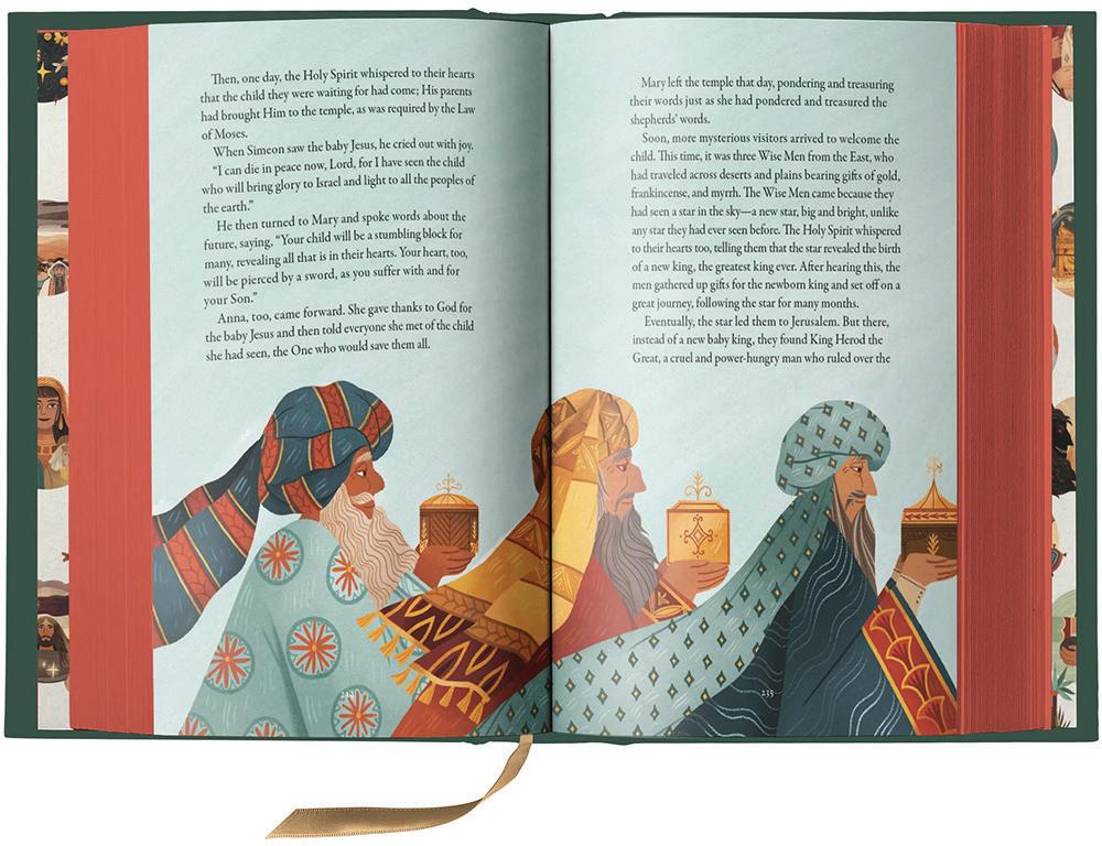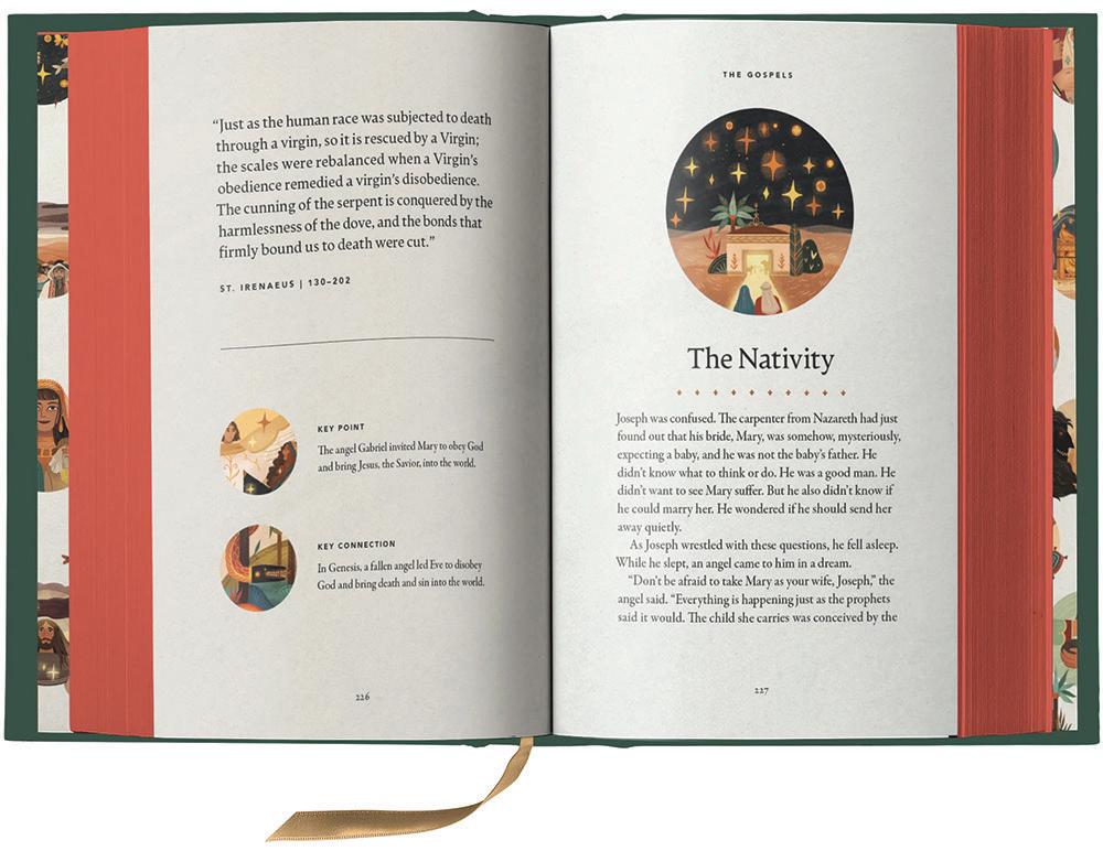 Unlike Protestant storybook Bibles, this features heavy biblical typology, showing how Old Tes tament stories point to Jesus, Mary, and the sac raments, along with illuminating quotes in every chapter from saints, popes, and Church Fathers.