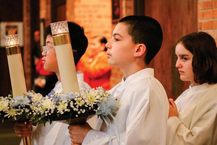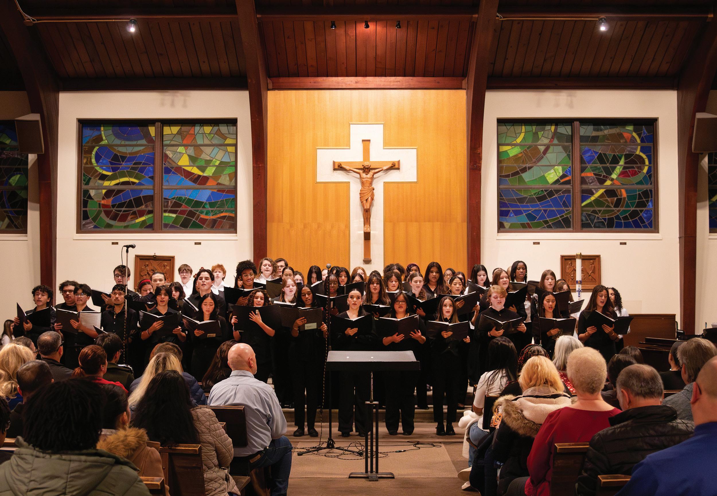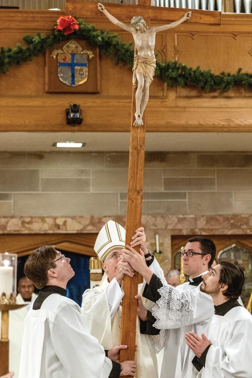 Members of the Body of Christ from throughout the Diocese of Metuchen united in celebrating the Jubilee Year of Hope, reflecting once again how their singular gifts and talents blended into a beautiful, diverse tapestry of faith. (1,2) Parishioners of many diverse heritages processed into an overflowing National Shrine Basilica of the Immaculate Conception, Washington, Sept. 20, during the diocesan pilgrimage to the nation’s Mother Church; (3) Teens who contributed their time, talent and treasure to their parishes and communities, earning them the coveted St. Timothy Awards, pose before the Cathedral altar Jan. 25, and (4) then-Bishop James F. Checchio lifts high the Jubilee Cross in the Cathedral of St. Francis of Assisi, Metuchen, Dec. 28, 2024, to mark the beginning of the Church-wide Jubilee Year of Hope. —Photos by John Batkowski (1 & 2), Mike Ehrmann (3) and Hal Brown (4).