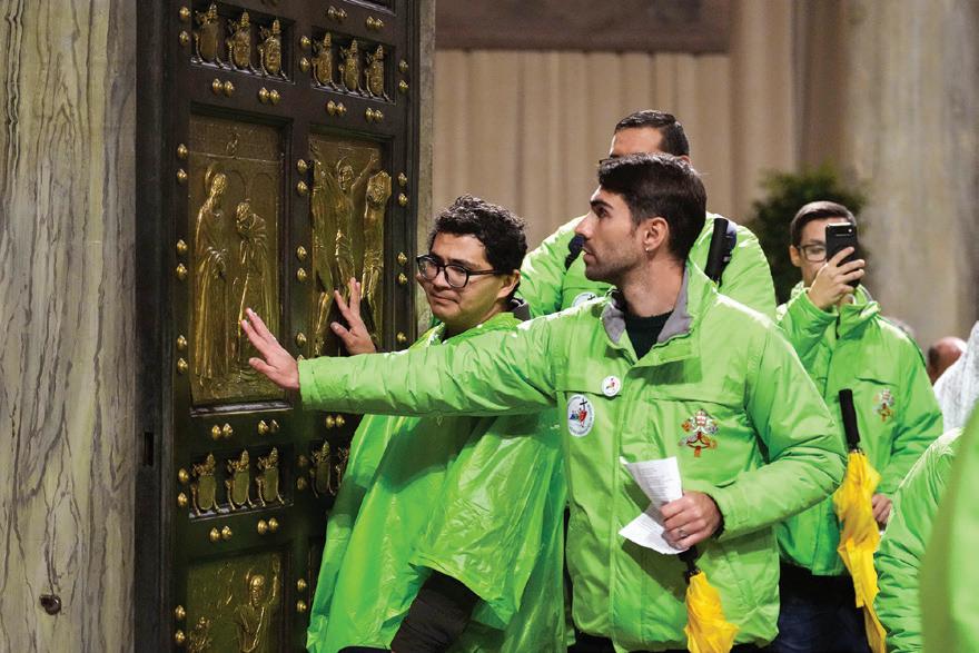 Jubilee volunteers touch the Holy Door at St. Peter’s Basilica at the Vatican Jan. 5, 2026, the last day it remained open before Pope Leo XIV officially closed it Jan. 6 to mark the end of the Holy Year. —CNS photo/ Lola Gomez