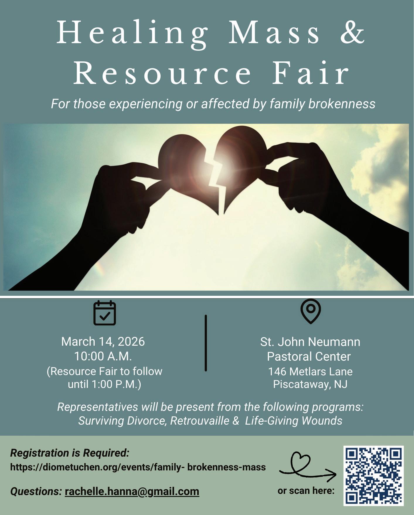 Family Healing Mass, for all feeling alone or grieving due to divorce, severe marital difficulties, as well as for children of any age who are affected by these facets of family brokenness. Please join us for a special Mass and Resource Fair on Saturday, March 14, at 10 a.m. at the St. John Neumann Pastoral Center, Piscataway. Representatives from “Surviving Divorce,” “Retrouvaille” and “Life-Giving Wounds” diocesan ministries will be present. There will also be activities for younger children while adults are looking into the resources. To register, please visit: diometuchen.org/events/family-brokenness-mass. Contact Rachelle Hanna for details at rachelle.hanna@gmail.com.