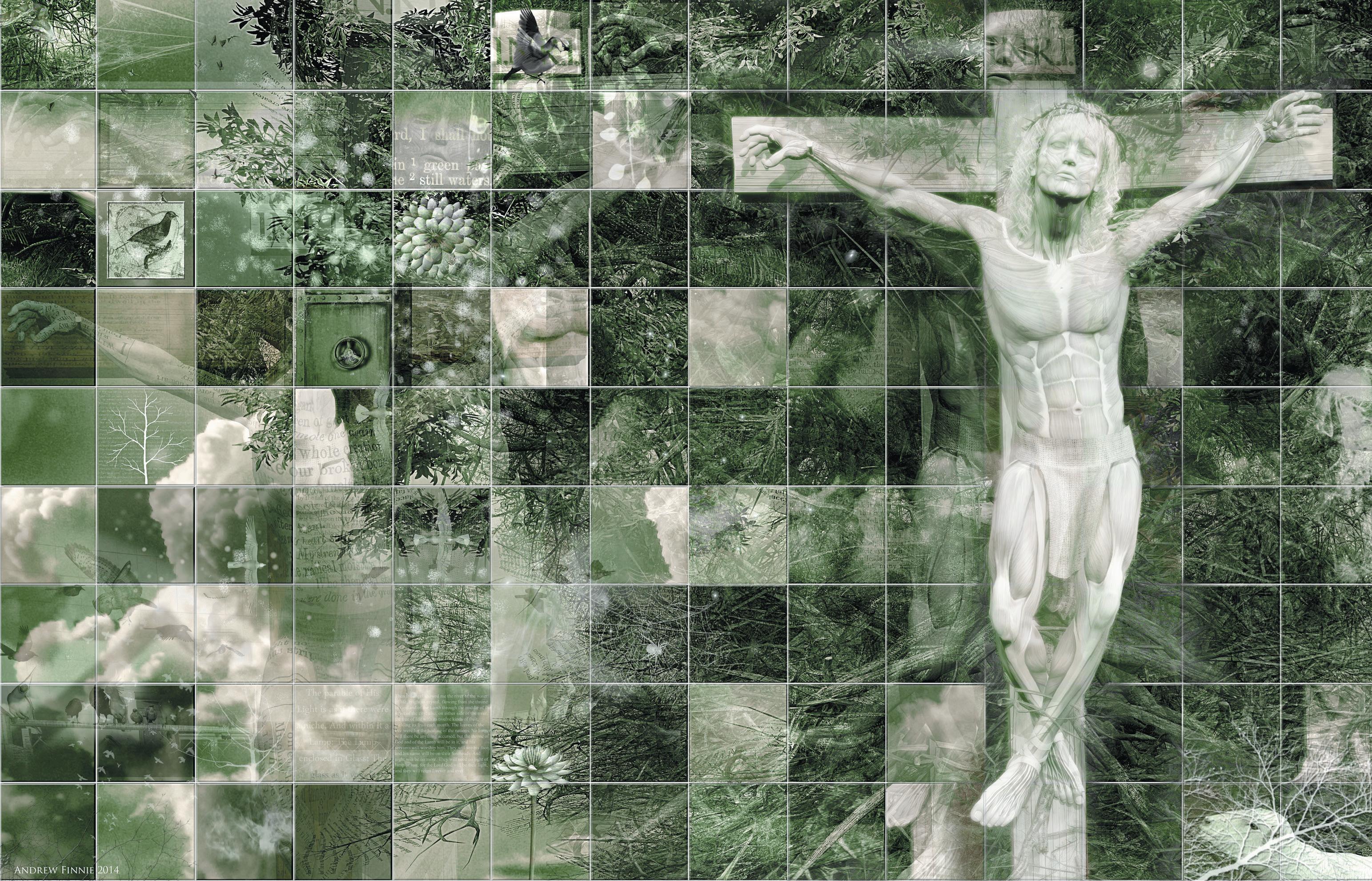 Here in this large-scale, digital image we have a multitude of visual fragments that work to express the complex significance of the cross for this time in history. Finnie has placed the cross, not in the position favoured in the Renaissance which is high in the sky in glory but instead deep into the shadows and roots of a large green tree.