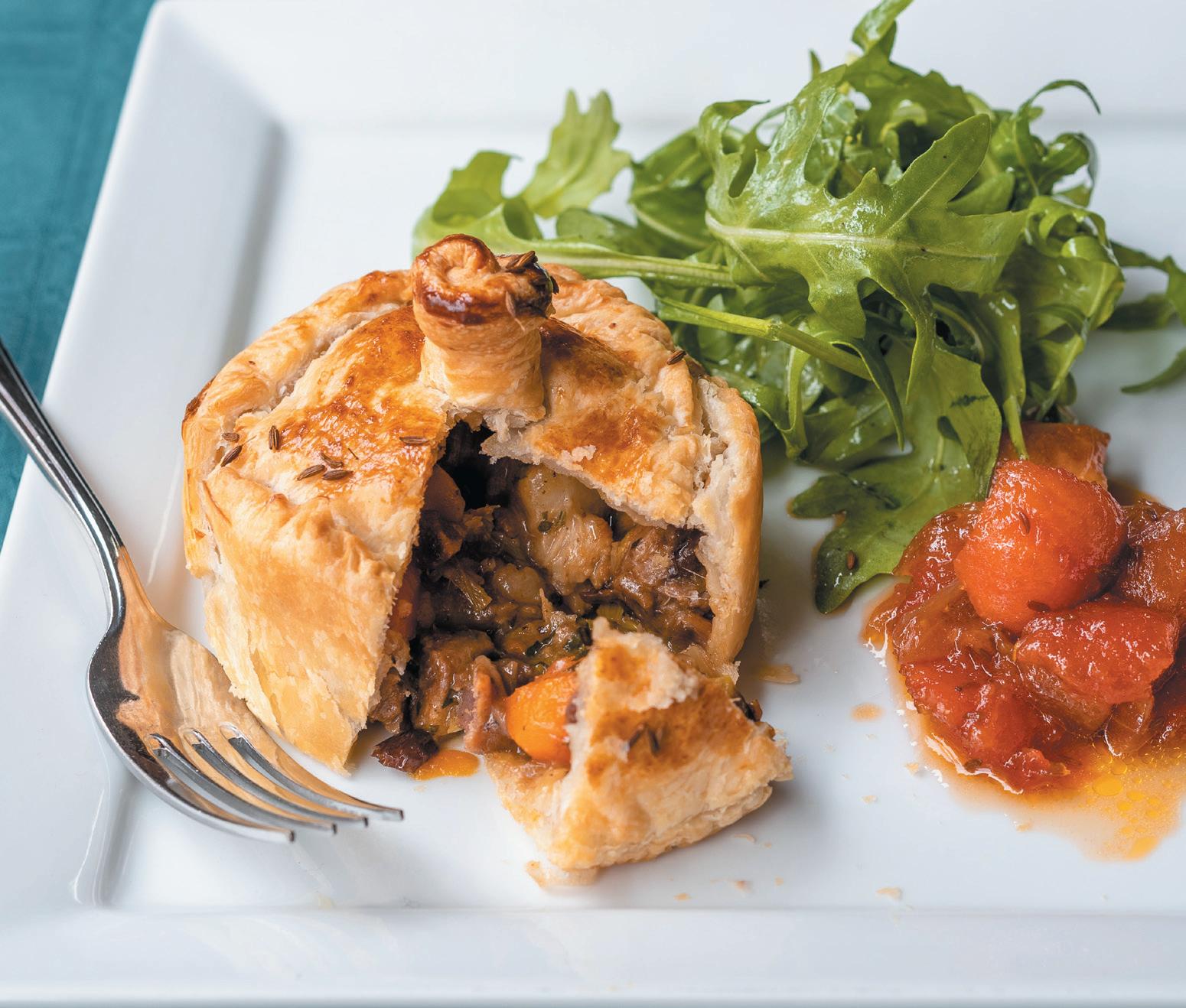 Fill with the mixture and top and seal with puff pastry lid. Paint a little egg wash over the pies and cook for 20 minutes.