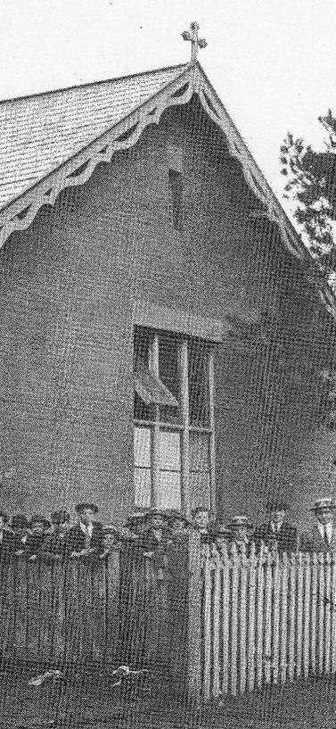 ‘A poor thing it was, but an achievement in the circumstances, filling for the nonce the double role of a church on Sunday and a school during the week. The roof was of bark and the walls of slabs so loosely put together that the openings between had to be plugged with mortar fortified with chunks of wood.’