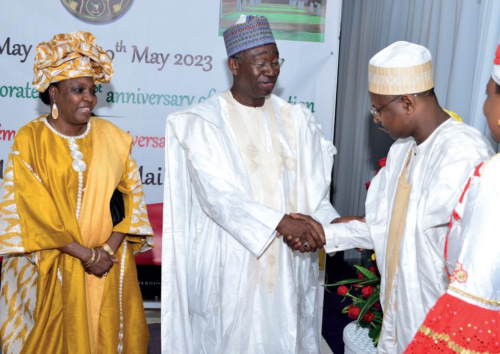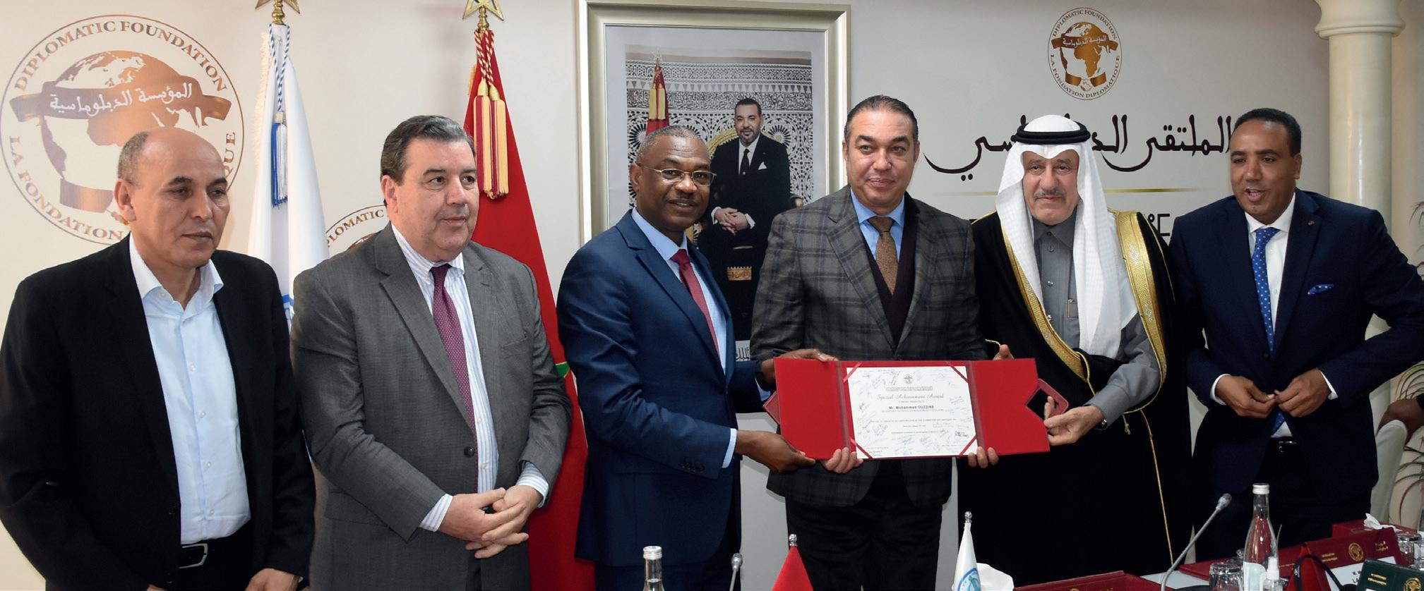 The Director of Protocol (MAECAMRE), Ambassador Anas Khales (left) congratulates the Ambassador of Cameroon, H.E. Mouhamadou Youssifou and his wife