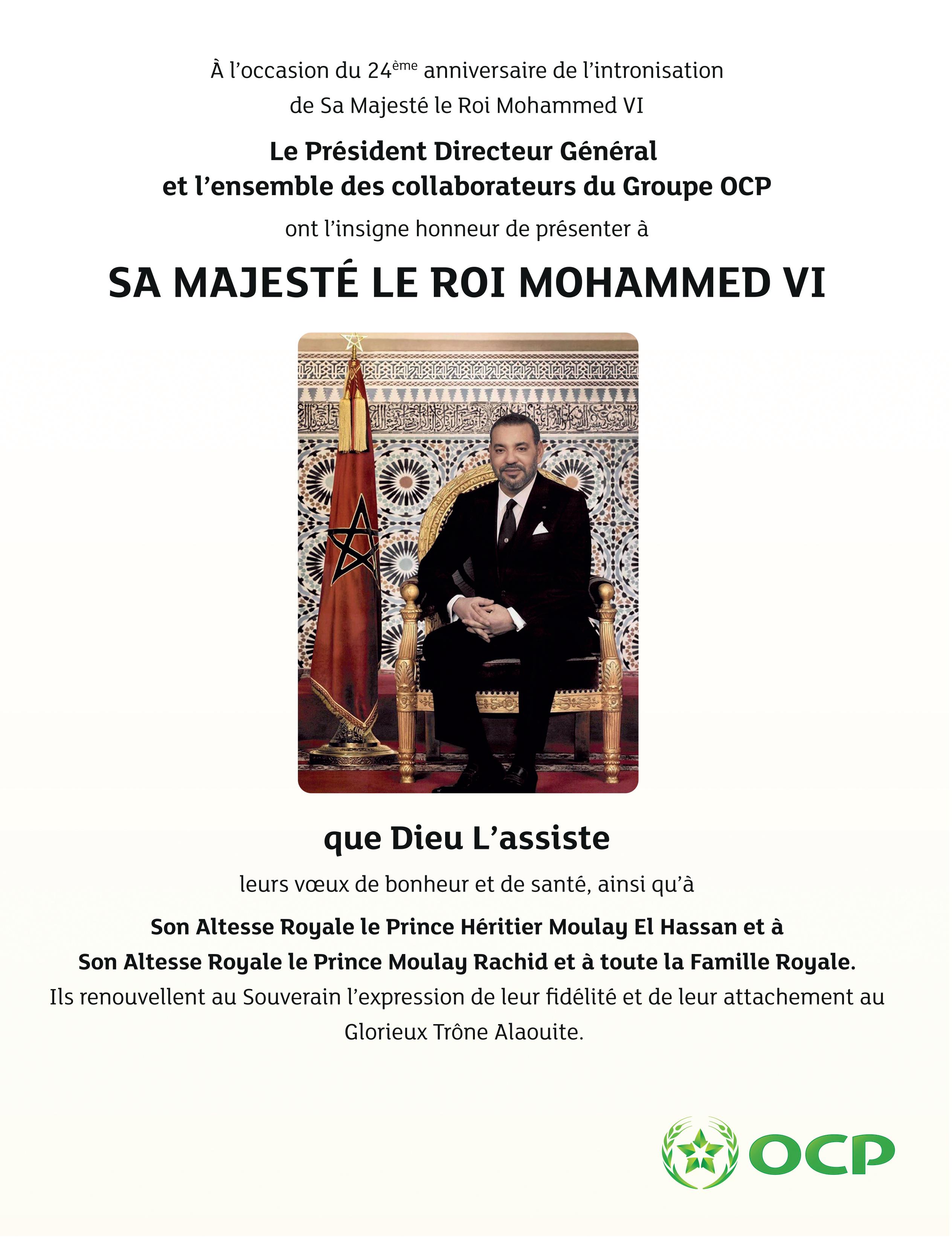 Sa Majesté le Roi Mohammed VI, que Dieu L’assiste, a adressé, samedi 29 juillet, un Discours à la Nation à l’occasion du 24ème anniversaire de l’accession du Souverain au Trône de Ses glorieux ancêtres. Voici le texte intégral du Discours Royal: