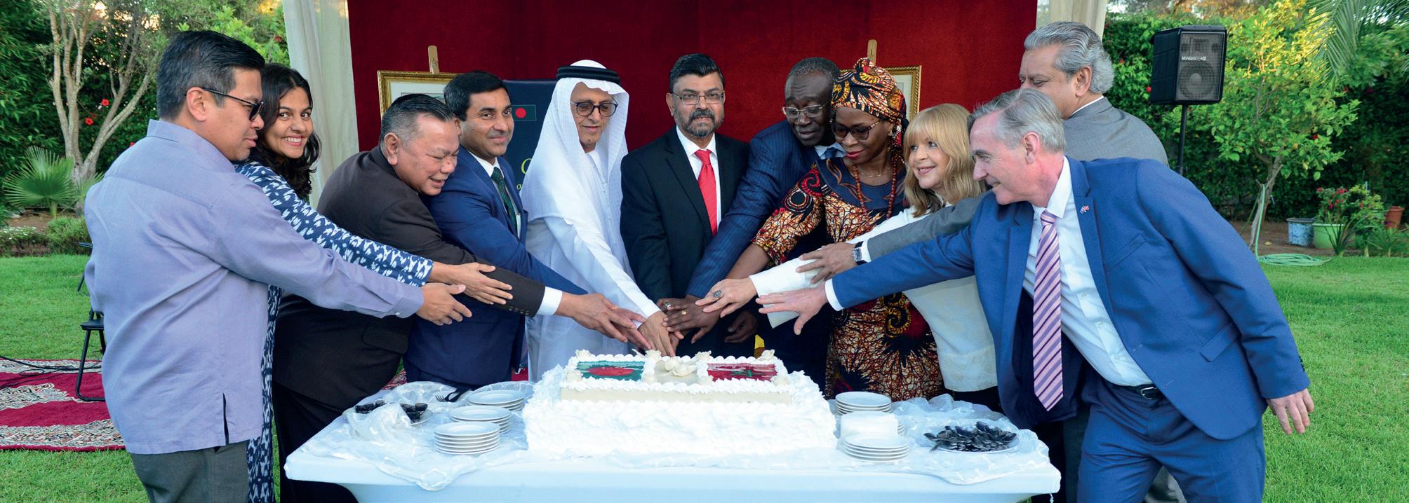 Les Ambassadeurs des Philippines, de Malaisie, d'Indonésie, de l'Inde, des Emirats Arabes Unis, du Cameroun, du Burkina Faso, de Croatie, du Pakistan et d'Australie entourent l'Ambassadeur du Bangladesh pour découper et apprécier le traditionnel gâteau d'anniversaire