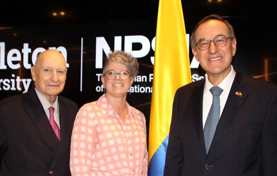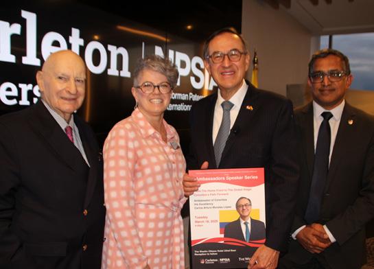 Colombian Ambassador Carlos Arturo Morales López spoke at the Ambassadors Speaker Series on March 18. At centre, Ambassador López holds his poster gift and is flanked by Lawrence Lederman, chair of the series, presented by Carleton University’s Norman Paterson School of International Affair (NPSIA), Brenda O’Neill, Carleton University’s dean of public and global affairs and Teddy Samy, director of NPSIA.